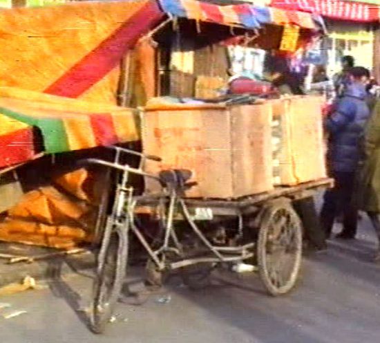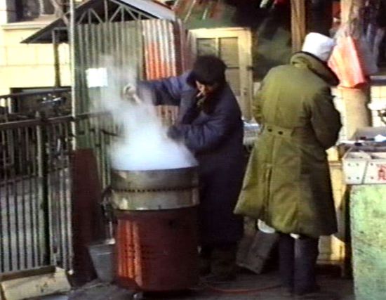 Von dort laufen wir mehr als zwei Stunden durch eisige Kälte (-11°C), kaufen für mich für 1,40 DM eine Wollmütze in der Einkaufsstraße Wanfujing. Im Seidenladen sind wir höchst amüsiert über den Geldtransport ('Schnur-Seilbahn').