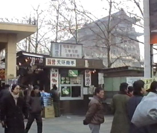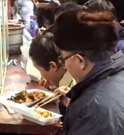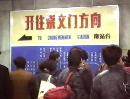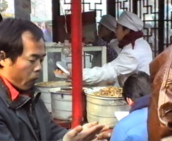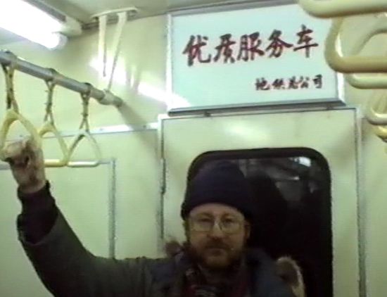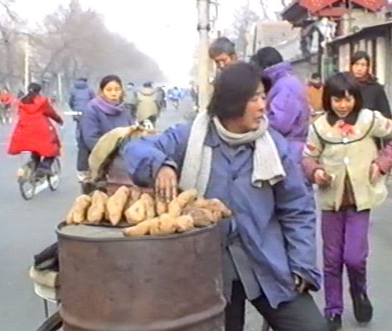 Dann verabschieden wir uns von unserem Reiseleiter und der Gruppe. Da wir jedoch am Straßenrand zunächst einmal wegen eines gewissen Hungergefühls Süßkartoffel von einem Fahrrad-Koch-Verkäufer probieren, bleibt auch ein Teil der Gruppe dort und Gao Ling - unser Reiseleiter - muß alle einzeln einsammeln. Nach dem Essen wird noch Litschi-Saft aus der Limotüte getrunken und ich gebe eine Runde Pinkel-Scheine (0,1 Yuan = 3 Pfg.) aus. Dann geht es zu Fuß bis zur nächsten U-Bahn-Station, 6 x 0,5 Yuan = 1,80 DM und das große Abenteuer geht los.