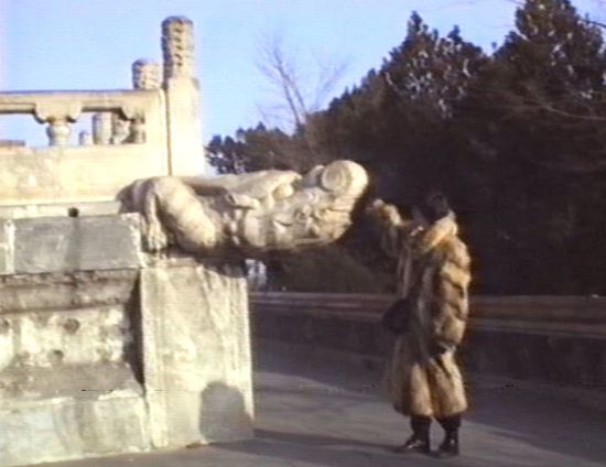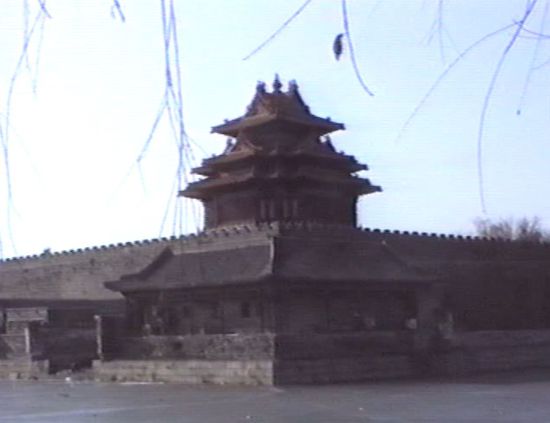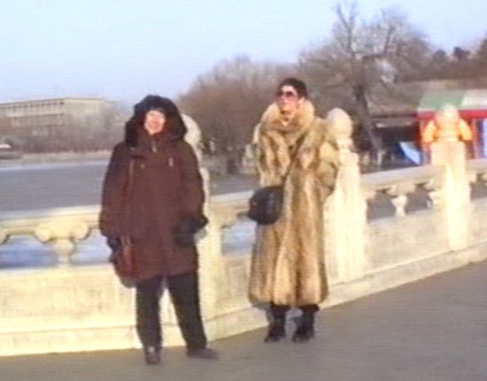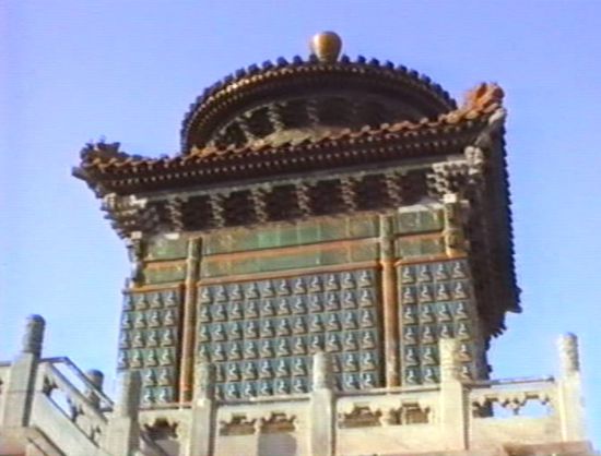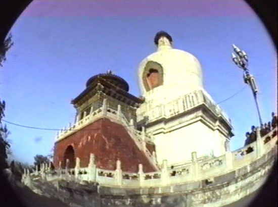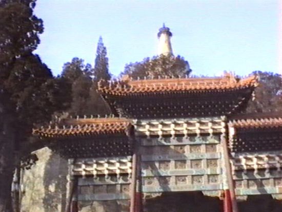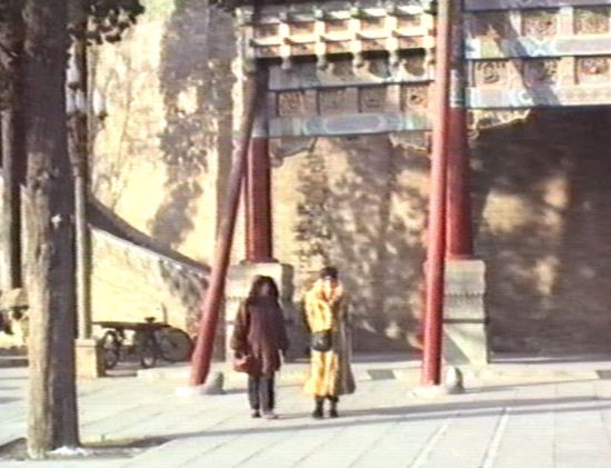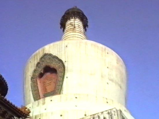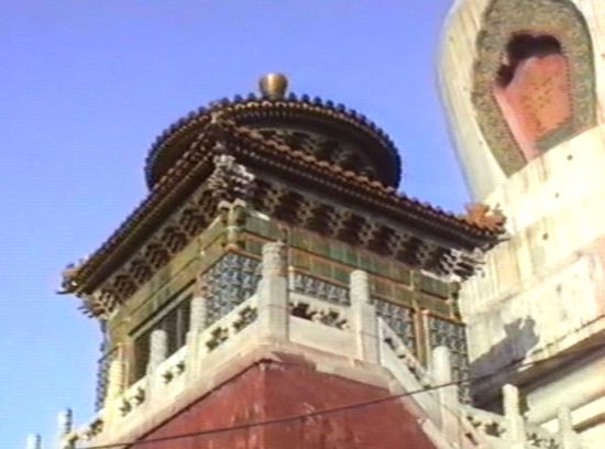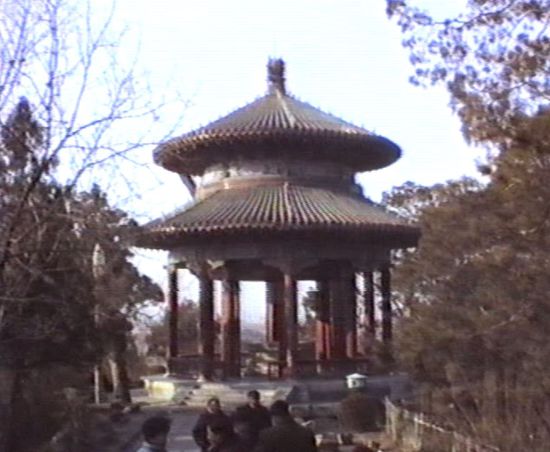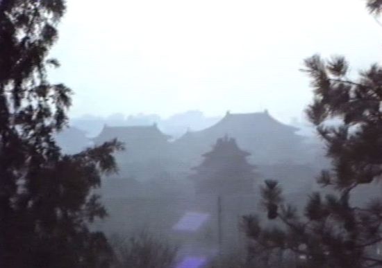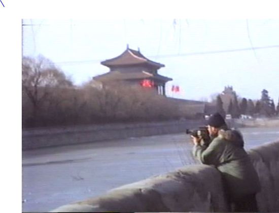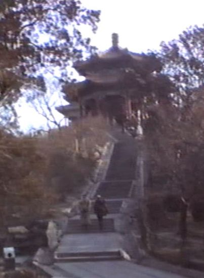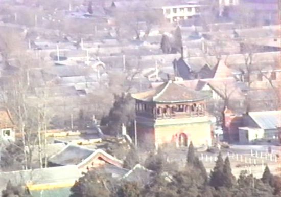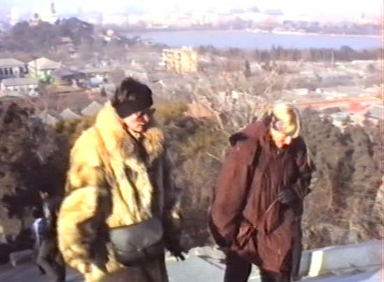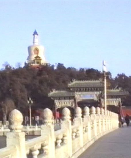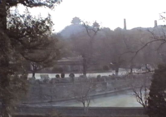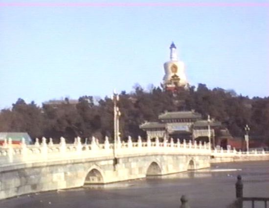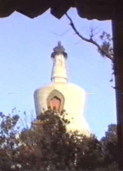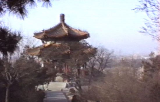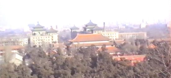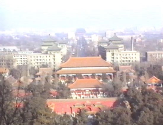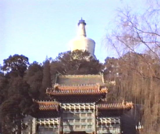 Nach Programm ist der heutige Tag zur freien Verfügung, doch F. und M. wollen allmählich ihr Programm aufnehmen, um nicht in Schwierigkeiten mit den beiden Ganztagsausflügen zu kommen. Sie fahren heute mit ihrer Gruppe zum Sommerpalast. Wir vier fahren dagegen mit einem Mercedes (3 Yuan/km) (die anderen 1/ 1,40/ 1,60 oder 2) zum Beihai-Park mit schöner Dagoba. Der Park ist sehr groß und wir schaffen nur den Weg den Hügel zur Dagoba hinauf, denn wir wollen auch noch auf den Kohlehügel, von dem wir einen wunderschönen Blick nach Süden auf den Kaiserpalast haben. Die Gebäude sind wegen der tiefstehenden Sonne alle nur als Silhouette zu sehen, aber der Blick auf die vielen Gebäude in hunderten von Grautönen ist gewaltig schön. Kurti muß einige Minuten genießen und alles auf sich wirken lassen. Er will uns die Aufnahme des Films 'Der letzte Kaiser' schicken.