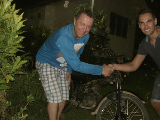 Mein Motorrad habe ich an diesen jungen Franzosen verkauft. Er will damit nach Kambodscha und Vietnam fahren. Ich habe 320 USD bekommen. In Hanoi hatte ich 220 USD bezahlt und unterwegs ca. 100 USD an Reparaturen bezahlt. Unter dem Strich bin ich also zum Nulltarif gefahren.