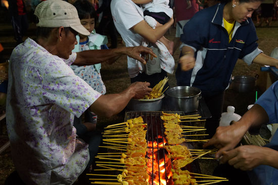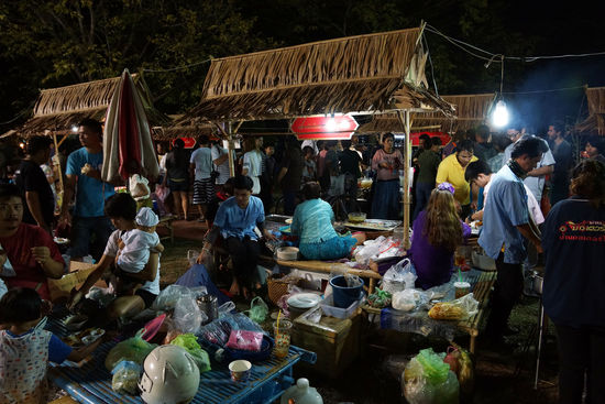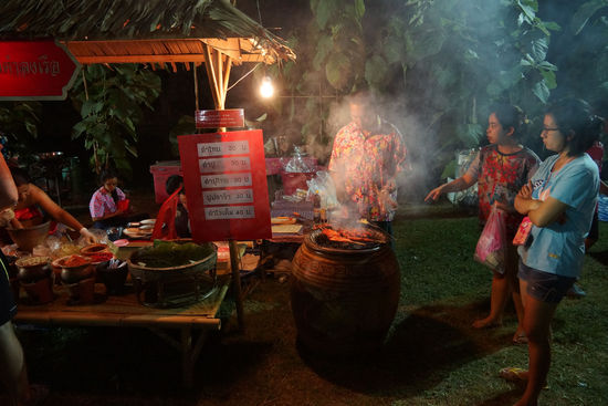 Nachdem wir den Schalter für Thai Rent a car gefunden hatten, stürzten wir uns in den thailändischen Linksverkehr. Übermüdet ist der deren Verkehr nicht das wahre. Die LKWs blinken generell nicht und die PKWs wechseln die Spur je nach Laune. Aber wir sind schlussendlich heil in unserem Quartier in Ayutthaya angekommen. Eigentlich wollten wir uns noch ein Abendessen im Baan Thai Guest House gönnen und dann schlafen gehen, aber der Inhaber des Hotels hat uns einen Tipp für einen abendlichen Ausflug gegeben. Dadurch haben wir uns gleich am ersten Abend ein Tuk Tuk gemietet und sind in die Innenstadt gedüst. Dort findet vom 18. bis zum 27. Dezember die Phra Nakhon Si Ayutthaya World Heritage Fair statt. Bei diesem Event gibt es zahlreiche Vorführungen und Hausfrauen verkaufen leckeres Essen an zahlreichen Marktständen. Natürlich haben auch wir uns die ein oder andere Köstlichkeit gekauft. Zahlungsmittel sind kleine Muscheln, die aus Ton geformt sind. Man kauft sich immer kleine Päckchen zu 10 Stück (je 100 Baht) und kann dann bei den Marktständen sein Essen damit bezahlen.