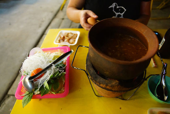 Suppe in einem Tontopf serviert, der auf glühenden Kohlen steht. Als Einlage kann man sich alles mögliche aussuchen: Hühner-, Rinder- oder Schweinefleisch, Schrimps, Nudeln, Eier etc. Das ganze wird dann je nach Belieben in dem Topf erhitzt und dann kann schon geschlemmert werden!