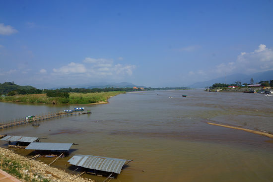 gemacht. Am Goldenen Dreieck hat man gleichzeitig die Länder Thailand, Myanmar und Laos vor sich. Wer möchte, kann auch mit einem der zahlreichen Boote eine Tour entlang des Mekong machen. In dieser Gegend sind die all gegenwertigen Polizeikontrollen natürlich verstärkt vorzufinden. Der Grund dafür ist der rege Handel mit Drogen in diesem Grenzgebiet. Bei uns vielen die Kontrollen nicht sonderlich genau aus. Meistens wenn die Polizisten sehen dass wir Europäer sind, winken sie einen gleich weiter - Gott sei Dank, denn gerade heute hatte ich weder meinen Reisepass noch Führerschein dabei - ein wenig nervös hat mich diese Tatsache dann doch gemacht. Aber alles ist gut gegangen. Im Grenzstädtchen Mae Sai haben wir noch einen kurzen Blick auf den Grenzübergang zu Myanmar gemacht. Als Tourist kann man für ein paar Baht die Brücke überqueren, und in Myanmar billigste Kopien von allerlei Dingen einkaufen.