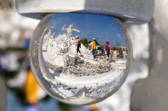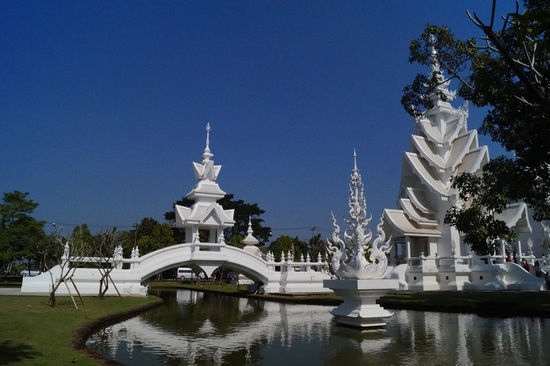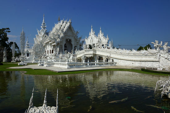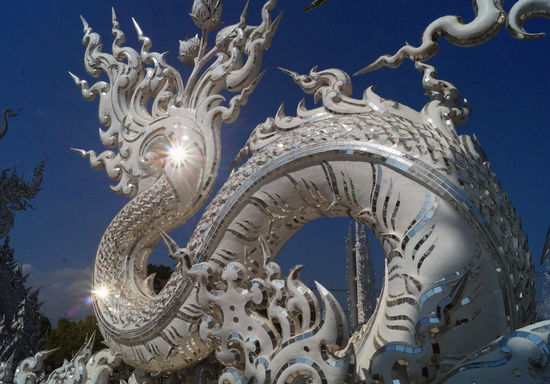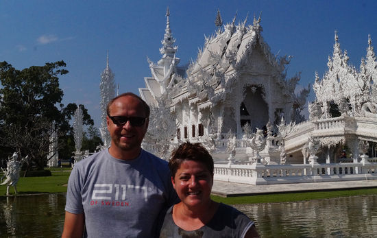 Gestern haben wir dann noch die letzten 200 Kilometer nach Chang Rai in Angriff genommen. Auf der wiederum teils sehr kurvigen aber gut ausgebauten Straße 118 sind wir mittags an unserem nördlichsten Punkt der Reise angekommen. Da das Wetter ein Traum war, und der weiße Tempel Wat Rong Khun direkt an der Hauptstraße liegt, wurde dieser gleich besichtigt. Dieser traumhafte Tempel der anderen Art, der von allen Postkarten lächelt, wurde 1997 erbaut und ist immer noch in Arbeit. Die weiße Farbe soll Buddhas Reinheit und die vielen kleinen Spiegel seine Weisheit symbolisieren.