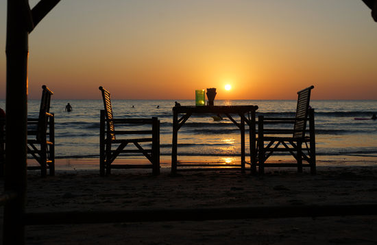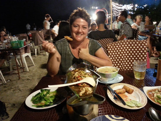 Koh Chang ist im Vergleich zu den anderen, größeren Inseln Phuket oder Koh Samui noch relativ beschaulich. Unser Quartier für die nächsten Tage war Banpu Beach Resort. Da das Essen rund um die Hotels um einiges billiger und ziemlich sicher auch besser und vor allem authentischer ist, haben wir unsere Unterkunft nur mit Frühstück gebucht. Unser Hotel liegt am White Sand Beach und man hat alle Möglichkeiten, lecker essen zu gehen. Da sich das Meer abends sehr weit zurück zieht hat man dann die Gelegenheit, sich an einen der gemütlichen Tische direkt am Strand (im Sand) sein Essen zu bestellen.
