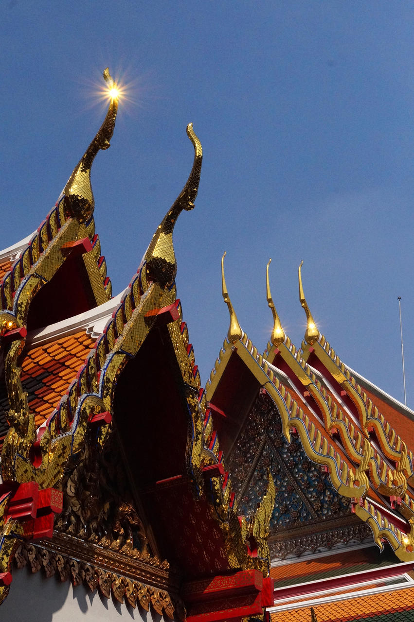 Irgendwann war uns der Trubel im Palast einfach zu viel. Man hat das Gefühl, dass zur Zeit sämtliche asiatischen Nationen auf Urlaub sind. Und wie wir wissen, sind das seeeehr viele Menschen . Um zum nächsten Ziel - dem Wat Saket - zu kommen, haben wir einen längeren Fußmarsch in kauf genommen - auch wenn uns wieder unzählige Tuk Tuk Fahrer angequatscht haben - nein danke! Der Wat Saket (auch golden mountain). Auf einem 79 hohen, künstlich aufgeschütteten Hügel, liegt diese älteste buddhistische Tempelanlage Bangkoks. Da sich dorthin nicht sehr viele Touristen verirren, haben wir die Stille und den Rundumblick auf Bangkok genossen.