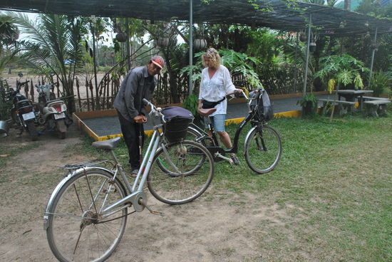 Es gibt Mountainbikes hier (7 USD/Tag), wir aber fragen nach den "anderen Fahrrädern", die es für 2 USD / Tag gibt. Ein verständnislosen Grinsen breitet sich über dem Gesicht des jungen Kambodschaners aus, der uns dann zwei Räder übergibt, die man in Deutschland nicht einmal geschenkt los werden würde. Aber die passen sich hier in die Landschaft einfach besser ein, außerdem haben sie Lenkerkörbe, wo wir Rucksack und Kameratasche unterbringen. Dies wäre bei den Mountainbikes nicht möglich gewesen. Gemütlich radeln wir die nicht geteerte Straße Richtung Stadt Kampot und werden regelmäßig mit einer Staubdusche versehen, wenn wir von Autos und Mopeds überholt werden.