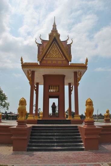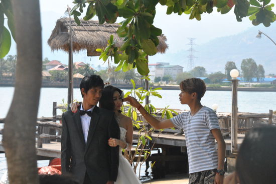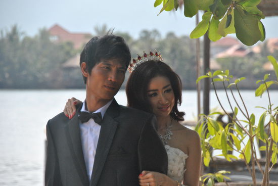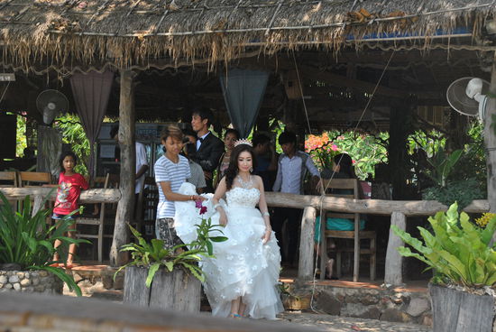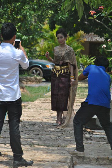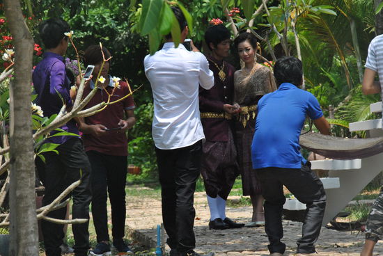Bis auf einmal ein Fotograf mit einer großen Kamera und Stativ auftaucht. Kurze Zeit später sehen wir warum: ein junges Paar mit einer ganzen Gruppe von Kambodschanern folgt. Wir vermuten, dass es sich um eine Hochzeitsgesellschaft und das Brautpaar handelt. Zunächst tragen beiden jungen Leute traditionelle Festkleidung. Vor Ort werden von 2 Stylisten letzte Handgriffe getätigt: Schmuck angelegt, Haare zurecht gelegt, die Flipflops der Dame gegen Pumps getauscht. Und dann geht es los, das Fotoshooting. Bevor der Fotograf auf den Auslöser drückt, biegt und drückt und rückt und schiebt er die Beiden zentimeterweise in die Positionen, wo er sie haben möchte, während die Stylisten an den Kleiderfalten zupfen.
