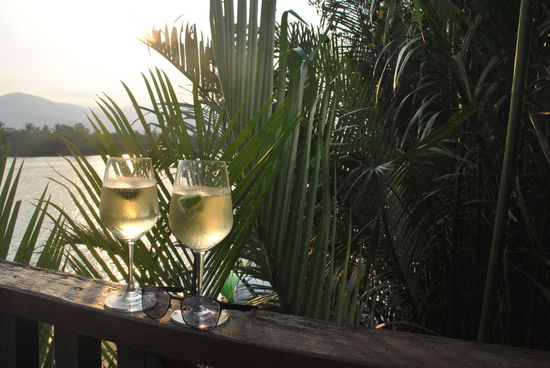 Nachdem wir die Räder schon haben, wollen wir auch wissen, was es in der anderen Richtung am Fluss entlang zu sehen gibt und machen uns am späteren Nachmittag nochmal auf. Wir passieren ein kleines Dorf und kurz nach einer Brücke entdecken wir eine Bar am Fluss, die uns schon von der Ferne auffiel, weil man da abends Licht sieht und Musik hört. Das wollen wir uns näher anschauen: