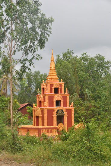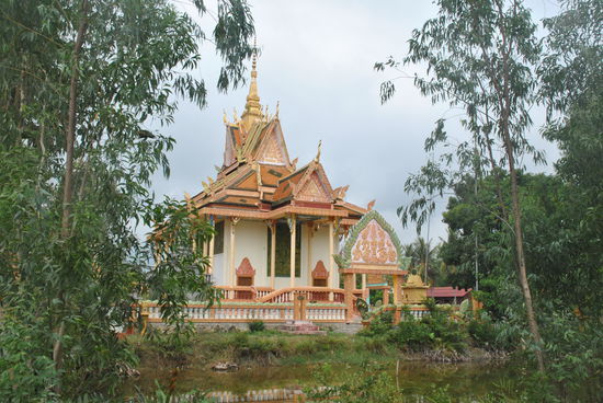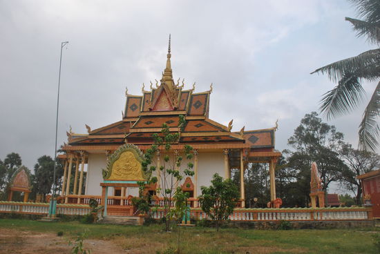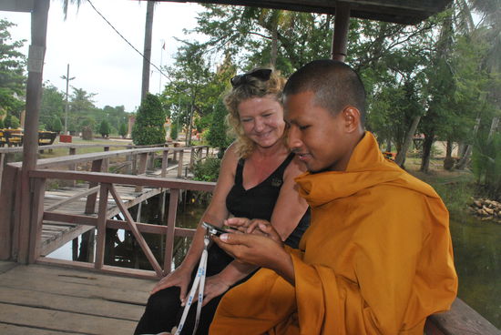 einer der vier jungen Männer kann ein wenig Englisch - sehr wenig - die Verständigung ist nicht einfach. Die Mönche fragen uns, woher wir sind, wir erzählen und zeigen Fotos von unseren "Kindern", die ja bereits groß sind. Dank Handys hat kann man ja heute Fotoalben ständig mit sich rumtragen. Am meisten "oho", "aha" und Fragezeichen in den Augen bewirkt ein kurzes Video mit Schnee, das Gaby zeigen kann oder aber Fotos von meinen Söhnen, die mit ihren muskulösen Körpern ein Erscheinungsbild haben, das es hier nicht gibt. Alle Kambodschaner sind relativ klein und schmächtig bis dünn.