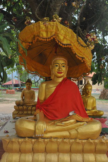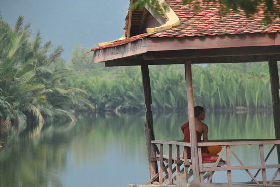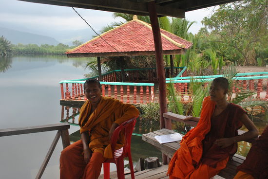 Wir machen einen kleinen Spaziergang. Keine 10 Gehminuten entfernt ist ein kleiner Tempel sowie ein paar Nebengebäude. Einige junge Mönche sitzen am Fluss, winken uns freundlich zu. Zunächst fragen wir, ob wir fotografieren dürfen - ja dürfen wir. Sie winken uns zu sich. Wir setzen uns dazu und dann ergibt sich folgende Situation: