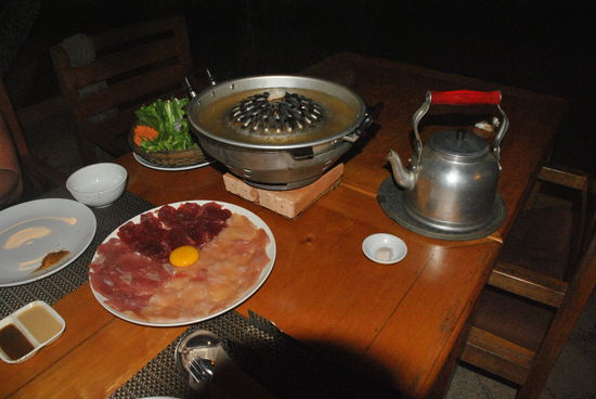 Abends bestellen wir uns ein Khmer BBQ. Das Ganze hat so etwas von einer Mischung aus Fondue und Grillen. Und ist letztlich super bekömmlich. Hier gibt es nur eine Sojasoße und eine Soße aus Pfeffer/Salz/Limetten... Nix Mayo & Co. Kein Brot dazu. Es gibt superdünn geschnittenes Fleisch (Huhn, Schwein, Rind) und Gemüse sowie Glasnudeln.