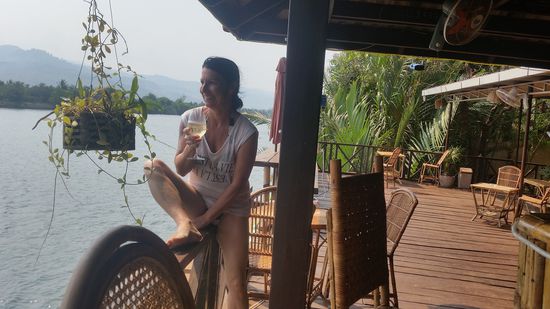 Nachdem wir diesen "Überfall" schadenfrei überstanden haben, landen wir an der Flussbar CHECK POINT KAMPOT an und genehmigen uns eine kühle Weißweinschorle auf den Schrecken. Und dazu wieder die tolle Aussicht, Abendstimmung und nette Gespräche mit interessanten Menschen - einerseits wunderschön, andererseits traurig, weil es der letzte Tag ist und wir beide gerade äußerst wenig Lust auf das kalte Deutschland haben.