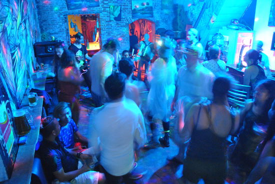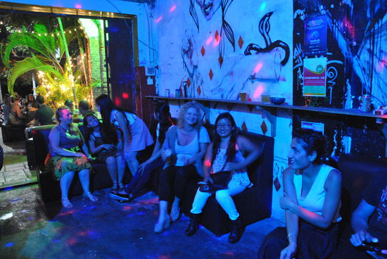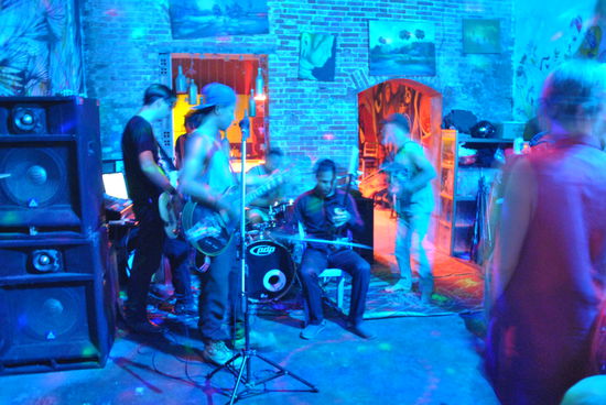 Hier mischt sich ein sehr buntes Publikum. Die Band besteht aus Bass, Gitarre/Gesang, Schlagzeug in minimalistischster Ausführung, Akkordeon und einem kambodschanischen Instrument, das mit einem Bogen gespielt wird - Mohori. Die Herren bringen so viel Stimmung in die Kneipe, dass am Schluss - trotz der Hitze - ganz viele Leute am Tanzen sind.