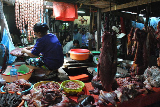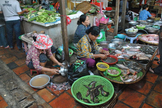 egal ob im engen Gang der Näherinnen oder auch in der "Fischabteilung": die Frauen sitzen am Boden, Füße im Fischabfall und hacken und nehmen die Fische auseinander... in den schmalen Gängen laufen wir durch eine Mischung aus Wasser und Fischblut... ich kann ja kaum noch etwas riechen, aber Gaby bemerkt, dass es erstaunlicher Weise gar nicht extrem riecht - folglich vermuten wir, dass das Zeugs wohl ziemlich frisch sein muss.