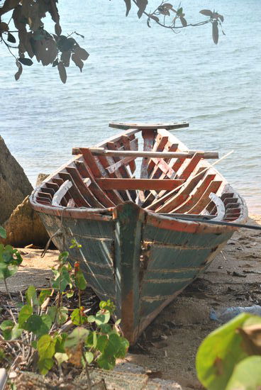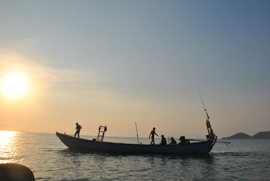 Gegen 17 h geht es dann mit unserem Boot wieder zurück. Inzwischen haben wir wieder die schöne Nachmittagssonne, die alles in das orange Licht getaucht, das so genial zum Fotografieren ist. ca. 100 m entfernt von der Küste, geht der Motor aus. Wir sehen irgendeine Flüssigkeit rauslaufen. Mit einem Schraubschlüssel rückt der Bootsfahrer dem Teil zu Leibe...