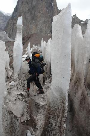 Sie haben, um sich zu akklimatisieren und aus Gewichtsgruenden, gerade das Essen und einen Teil der Ausruestung auf Camp 1 getragen und sind nochmal ins Basislager zurueck gekommen. Die Penitentes die es da zu durchschreiten gilt, sind anscheinend fotogen aber anstrengend... puh das wird harte Arbeit.