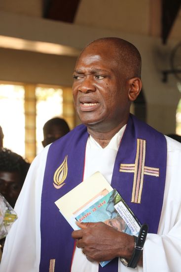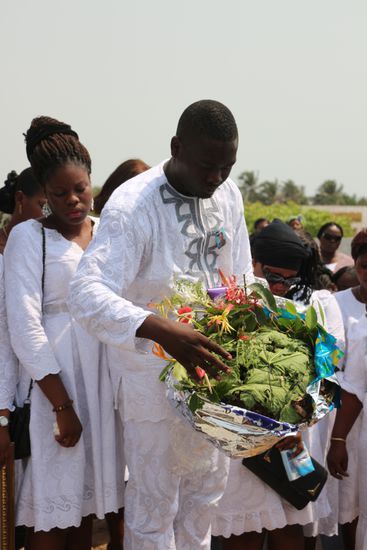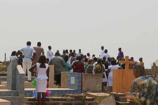 Ich fragte eine der Umstehenden, ob das die Frau oder die Tochter des Verstorbenen sei. Es sei die Tochter. Dann setzte sich der Zug in Bewegung. Im Auto oder zu Fuß legten die Anwesenden den Weg bis zum Friedhof in Grand Popo fort. Ich reihte mich ein. Niemand nahm Anstoß daran.