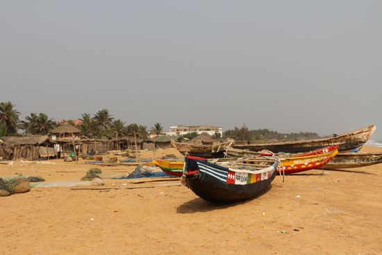Etwa 2,5 km später entschied ich mich, doch am Strand weiter zu gehen. Ich kam vorbei an den Behausungen der Fischer, ihren alten und neueren, teilweise bunten Booten. Viele saßen unter einem Palmendach und flickten ihre Netze. Zwei Jungen tummelten sich in den Fluten des Ozeans. Dazu mussten sie ja nicht weit laufen, denn kaum war die Uferkante erreicht, kam eine Welle und sie waren überspült.