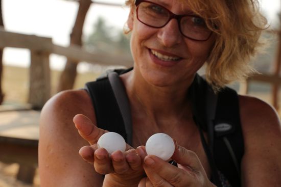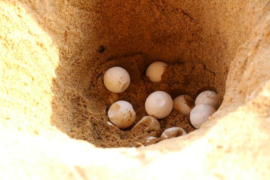 Etwa 100 m bevor ich sie erreicht hatte, wurde ich wieder einmal gegrüßt: "Bonjour, comment ça va?", "Bonjour, bien, merçi, et vous?" Der junge Mann stellte sich als Roger vor und lud mich ein, mir seine Idee von einem Restaurant, Café und Bar anzusehen. Da er gerade an seinem Vorhaben gearbeitet hatte, musste ich ja nur einen Schritt auf ihn zugehen. Es entspann sich eine Unterhaltung in deren Verlauf er mir erzählte, er würde nachts die Eier der Riesenmeeresschildkröten einsammeln und sie beschützen, damit die Fischer da hinten am anderen Ende von Grand Popo sie nicht zu Omelett verarbeiten. Ob ich sie mal sehen wollte. Ja, wollte ich. Er fing im Sand zu graben an, bis die ersten Eier, groß, weiß und rund wie ein Tischtennisball, in einer Tiefe von etwa 30 cm sichtbar wurden. Er gab mir zwei in die Hände. Weich waren sie und ich hatte Sorge, ich könnte sie versehentlich zerquetschen. Doch ich war vorsichtig genug. Die hätte er letzte Nacht gefunden. Er gehe jede Nacht den Strand ab und schaue nach den Spuren der Riesenschildkröten, um die Eiablagegruben zu finden und die Eier sicher bei sich zu verwahren. In diesem Loch seien etwa 200 Eier. In 43-46 Tagen würden die Schildkröten schlüpfen.