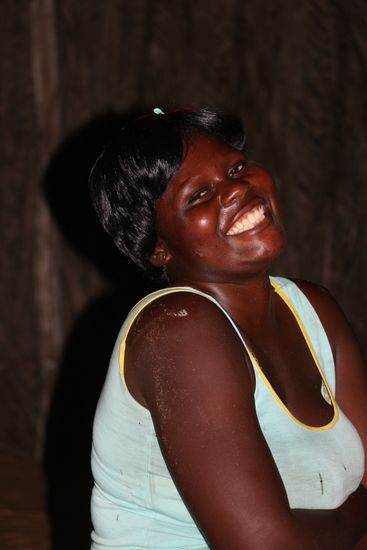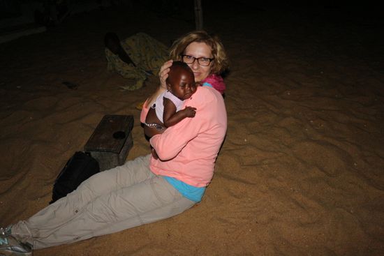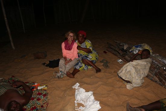 Roger kam pünktlich. Da ich keine Taschenlampe hatte (die habe ich in Ganvié gelassen), gingen wir erst in sein Dorf zu irgendeiner Verwandten, die uns eine Taschenlampe gab. Die hatte einen ordentlich hellen Schein. Dann begannen wir unsere Wanderung. Nach etwa einer Stunde lud er mich zu einer kleinen Pause ein und wir gingen auf eine Bastmatte statt Tür zu, hinter der wiederum Verwandte von ihm wohnten. Wir trafen auf vier Frauen, einen 10 jährigen Jungen und den Vater des Jungen. Alle lagen bzw. saßen im Sand vor ihren Hütten. Sie holten mir einen Holzhocker, doch ich zog es vor, mich zu ihnen in den Sand zu setzen. Sie freuten sich darüber und stellten fest, ich würde wie eine Afrikanerin sitzen. Vorstellung und lockere Unterhaltung über Familien, Mehrfrauenehen, Unterschiede zwischen Europa und Afrika, hauptsächlich im Bereich von Ehe und Familie.