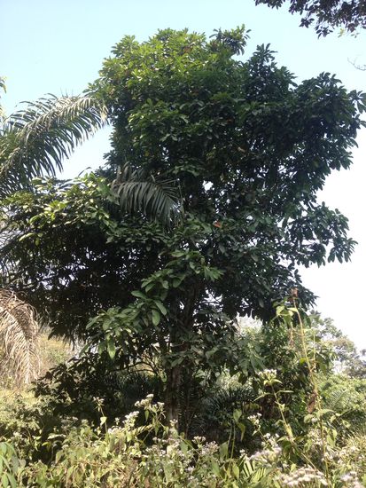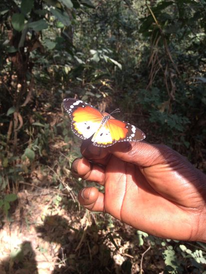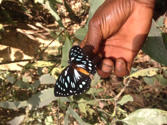Unterwegs begegneten wir mitten im Wald mehreren Frauen, die fermentiertes Maniokmehl aus großen Säcken in kleine Plastetüten pressten, die später verkauft werden sollen. Fotografieren wollten sie sich nicht lassen. Unterwegs zeigte uns Prosper, aus welchen Pflanzen welche Farben gewonnen werden. Er, wie auch sein Sohn sind nämlich auch noch Maler und nutzen ausschließlich Naturfarben. Prosper war vor kurzem in Frankreich und hatte dort eine Ausstellung seiner Werke. Als ausgezeichneter Schmetterlingskenner, ausgerüstet mit einem Kescher, fing er unterwegs ganz viele verschiedene von den herrlich bunten Tieren und wir hatten ausreichend Gelegenheit, sie zu fotografieren und betrachten, ehe sie wieder flattern durften. Wir kamen an Maniokfeldern vorbei, sahen  Ananas in Blüte und fast reifer Frucht, Kakaobäume, Teakbäume und vieles mehr. Die Teakbäume sollen bereits nahezu ausgewachsen sein. Bei deren Größe kann ich mir kaum vorstellen, dass daraus richtige Möbel gemacht werden. Vielleicht sind es auch keine Teakhölzer? An manchen Bäumen waren Ameisenhaufen zu sehen. Aus diesen stellten Prosper und sein Sohn Masken her. Die sehen recht gruselig aus. Mehrere Ansiedlungen jeweils einer Familie durchstreiften wir auf unserem Weg. In der einen lag ganz viel Kaffee zum Trocknen in der Sonne, auch irgendwelche Pflanzen gegen Magenschmerzen. Dann wieder trafen wir eine Frau, die an einem brodelnden Kessel auf offenem Feuer mit einem Palmwedel in roter Flüssigkeit rührte. Hirsebier für die morgige Silvesternacht wurde gebraut. Wir schauten eine Weile zu, ehe es uns zu heiß wurde, nicht nur wegen des Kochtopfes, nein - auch die beiden herumliegenden Hunde knurrten vernehmlich.