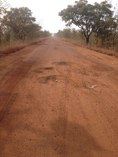 Nach einigen Kilometern bogen  wir ab und vor uns lang die Piste. Es dauerte nicht lange, da trafen wir an einem wahnsinnig hohen Termitenhügel, dem zur Seite ein Papayabaum stand, auf ein paar Menschen. Wir kamen schnell mit ihnen ins Gespräch. Das heißt, eigentlich eher mit dem Mann, denn die Frauen sprachen kein Französisch. Sie gehörten zum Stamm der Fulma. Als nächstes hielten wir in einem Dorf, durch das die Straße führte. Aussteigen und ausschwärmen. An einem großen Baum war eine Gruppe Kinder. Die Jungen schossen mit einer Steinschleuder in den Baum hinein, um die Flughunde, die in ihm schliefen, herunter zu holen. Doch die meisten der Tiere wurden nur aus dem Schlaf gerissen und flogen schnell in einen anderen Baum. Dann blickten wir in eine Hütte, in der Maniokmehl mit einer benzinbetriebenen Mühle gemahlen wurde. Dennoch wurde zunächst vor dem Eingang gestampft.