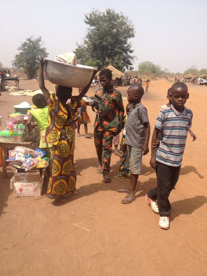 Dann fuhren wir weiter. Im nächsten Dorf, das wir passierten, war Markt. Also doch wieder aussteigen und mal ein wenig schlendern. Es war kein Markt, wie wir ihn bisher gesehen hatten. Nein, es saßen Frauen auf Decken unter Bäumen und boten Ware an. Bohnen, Hirse, Reis..... Auch wuchtige Yams wurden verkauft. Unter einem Baum wurden zwei Ziegen die Beine zusammengebunden, alsdann einem jungen Mann auf sein Motorrad gepackt, auf dem sich bereits ein Huhn befand. Später fuhr er an uns vorbei und hatte neben dem ganzen Getier noch zwei weitere Mitfahrer auf seiner Maschine.