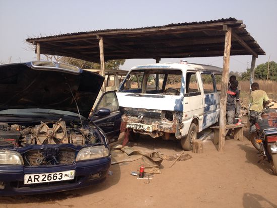 In der nächsten Stadt, Bassila, stiegen wir aus und gingen zu einer Mechaniker-Werkstatt. Wie sagte François so schön: die Autos kommen oft aus Europa, sind 20-30 Jahre alt und müde. Hier werden sie wieder wach gemacht. Wir sahen eine Weile zu, wie ein, nicht mehr wirklich als Kleinbus erkennbarer, Fahrzeugkorpus für eine neue Farbe vorbereitet wurde und was einer der Mechaniker am Motor eines Peugeot rumwerkelte.