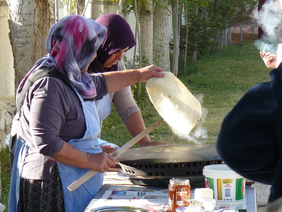 3 Raki später rollen plötzlich 5 fette Toyos aus Frankreich auf den Hof. Unerwartete Campinggäste. Man sieht förmlich die Dollarzeichen in Rasim’s Augen aufblitzen. Da Rasim sein Teppich-Business hauptsächlich in Frankreich abwickelt, spricht er sehr gut Französisch und wir sind erst mal vergessen. Jetzt kommt Stress auf. Als die neuen Gäste sich auf dem Platz einrichten, greift Rasim zum Handy und muss organisieren. Irgendeine seiner 8 Schwestern (oder waren es 6??) wird angeheuert, sein Neffe muss zum 3. Mal los Brot holen, irgendeine Schwägerin muss kochen und er organisiert, was das Zeug hält. Alles schon etwas schwierig, weil der Raki seine Wirkung tut. Ralf’s Dusche wird neuerlich vertagt, weil jetzt erst wir beide essen müssen. Ok, soll uns recht sein, denn auch wir spüren den Raki langsam. Es gibt das übliche – Salat, danach eine Suppe, Gemüseauberginenmischmasch mit Reis und superleckeren Honigmelonen, dazu eine Flasche Rotwein. Wir bekommen Gesellschaft von den Franzmännern, die natürlich ausnahmslos nur Französisch reden und wie üblich nicht mal den Versuch machen, in der Landesprache zu kommunizieren.
