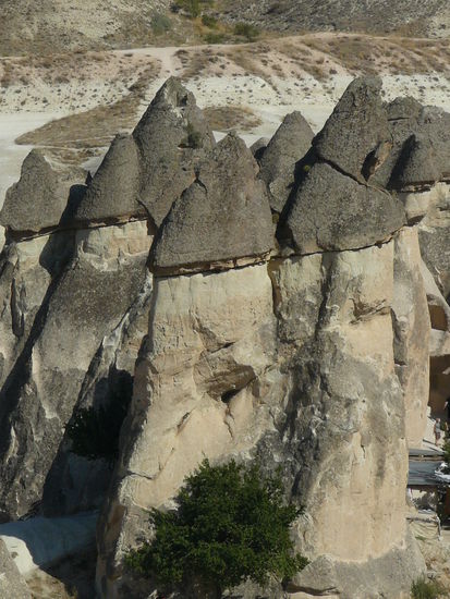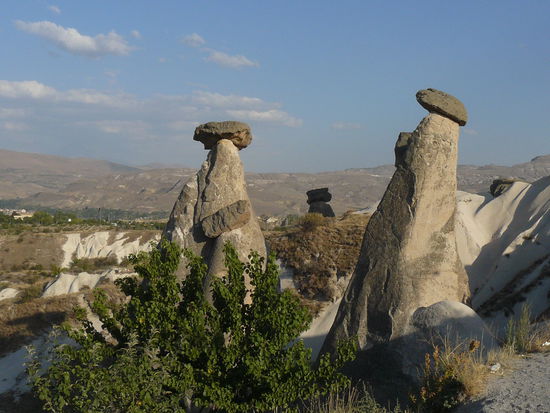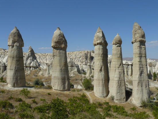 Insgesamt 4 Tage bleiben wir hier, besuchen die Ihlara-Schlucht mit ihren Höhlenkirchen, wandern im Rosental, in der Roten Schlucht und bestaunen das Liebestal mit seinen phallusartigen Tuffpyramiden, die in der Tat unanständig ausschauen. Wir besuchen Mustafapaşa mit dem nahen, völlig einsamen Gomeda-Tal, Uçhisar mit seinem wie ein Schweizer Käse durchlöcherten Burgberg und bummeln durch Ürgüp. Auf dem Weg nach Zelve – einem weiteren Tal ähnlich dem Göreme Open Air Museum mit vielen Kirchen und Klosteranlagen – stoppen wir im Paşabaĝi Tal mit seinen Feenkaminen, die teilweise zu Zwillingen oder Drillingen zusammengewachsen sind. Wir können uns nicht satt sehen, staunen mit offenen Mündern über diese einzigartige Landschaft, die durch gewaltige Vulkanausbrüche vor Millionen von Jahren entstand.