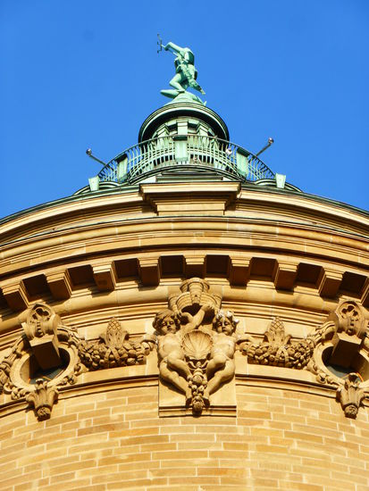 Das Dach des Turmes bekrönt eine Statue der Amphitrite, der Gattin des Meeresgottes Poseidon. Auch der weitere Bildschmuck und die Figuren am kleinen und am großen Becken nehmen die Thematik Wasser auf.
