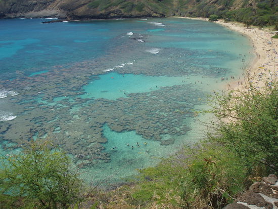 Heute ist zeitiges Aufstehen angesagt, denn ich möchte zur Hanauma Bay, bevor dort der Massenbetrieb das Erlebnis trübt. Gegen 8:00 sind erst ein paar vereinzelte Strandbesucher schon da. Die "Einführungslektion" beim Eintritt wird für etwa 6 Personen gehalten, dann darf man hinunter in den ehemaligen Vulkankrater. Trotz des Massenansturms sind noch viele Fische und Korallen zu sehen, man muss nur etwas Geduld aufbringen. Gut ist es auch, sich vorher die Lage der Korallenbänke und der Zugangsmöglichkeiten zu merken, sonst hat man schnell den Eindruck, rundherum von Korallen bis fast zur Wasseroberfläche umgeben zu sein. Gegen 11:00 wurde es mir dann zu voll, obwohl man auf dem Bild noch einigen "Platz" im Wasser erkennen kann.