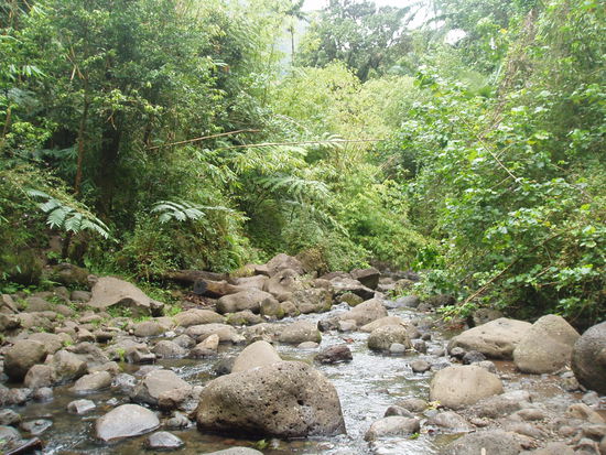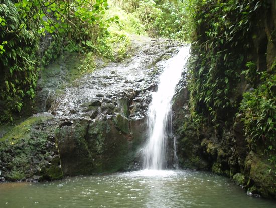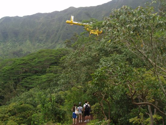 Weiter geht es durch Kaneohe hindurch zur Maunawili Road. Am Ende der Straße kann man in einem Wohngebiet parken. Von hier aus führt ein schöner Wanderweg zu den Maunawili Falls. Es ist hier nicht so einsam wie auf Kauai, aber auch nicht überlaufen. Der Weg führt über einen Berggrat mit schönen Aussichten. Höhepunkt ist ein Hubschrauber, der an der einzigen breiteren Stelle des Weges kurz landet und dabei mit seinem Rotor das umliegende Gebüsch "mäht". Einheimische verraten mir dann, dass auf diese Weise die spärlich vorhandenen Notlandplätze benutzbar gehalten und erprobt werden. Die letzten Meter bis zum Wasserfall muss man im Flussbett zurücklegen, über die Steine geht es ganz gut.