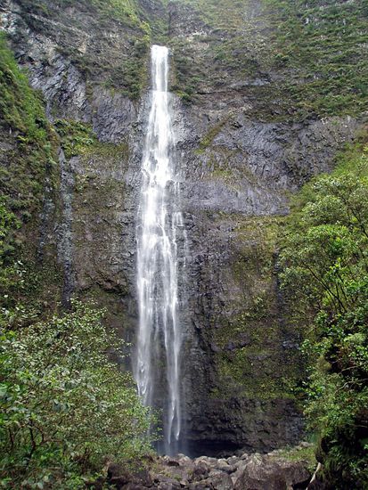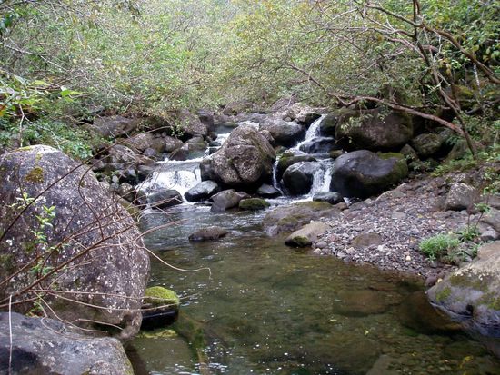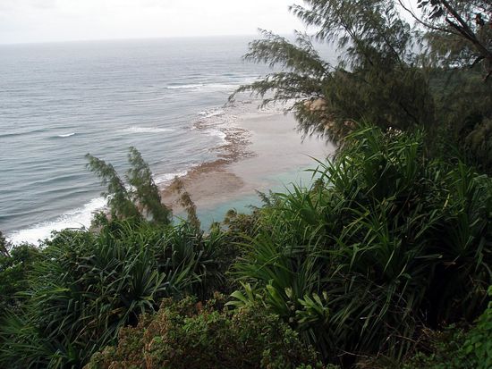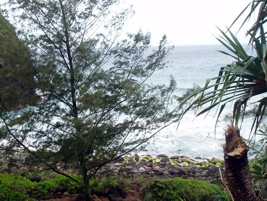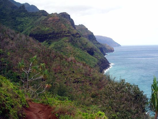 Die Hanakapiei Falls sind eindrucksvoll. Mittlerweile hat sich der Regen allerdings verstärkt, auch ist es deutlich kühler geworden. Bei geschätzt "nur" noch 20°C fällt ein Bad in dem Pool diesmal aus. Auf dem Rückweg begegne ich etlichen Wanderern, die mit dem mittlerweile recht rutschigem Terrain Probleme haben. Ein Wanderstock ist hier sehr hilfreich. Auf dem Rückweg an der Küste haben sich die Stufen in eine Serie von Mini-Wasserfällen verwandelt, aber schließlich kommt der Kee Beach wieder in Sicht.