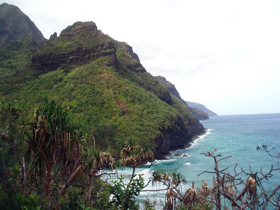 Heute soll es auf dem Kalalau Trail an der Na Pali Küste bis zu den Hanakapiei Falls gehen. Ein zeitiges Kommen (gegen 9:00) sichert einen Parkplatz gleich am Beginn des Weges am Kee Beach. Das Wetter sieht "durchwachsen" aus, "flüssiger Sonnenschein" mit wechselnder Intensität begleitet einen großen Teil des Weges.