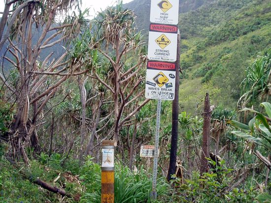 Am Hanakapiei Beach angekommen sind die Warnschilder einige Aufmerksamkeit Wert. Jetzt im Winter gibt es keinen Sand an diesem Strand, so dass die Verlockung zu einem (gefährlichen) Badeausflug entfällt. Der Hanakapiei Stream muss mehrfach überquert werden, der Wasserstand ist noch nicht im gefährlichen Bereich.