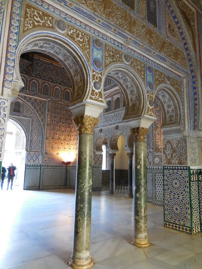 Für heute morgen habe ich ein Online-Ticket für den Alcázar von Sevilla inklusive Ticket für das cuarto alto auf dem Palastgelände. Auch der Alcázar von Sevilla sieht aus wie ein alter maurischer Palast, ein sehr großer prunkvoller noch dazu. Tatsächlich steht er auch auf den Fundamenten der maurischen Festungsanlage der Almohaden. Aber der eigentliche Palast ist erst in christlicher Zeit entstanden, allerdings war der Bauherr Pedro I ein Liebhaber islamischer Kunst und so kam es zu dem Stil, in dem der Palast erbaut wurde. Er gilt heute als ältester königlicher Palast Europas. Und er wird von der heutigen königlichen Familie noch immer genutzt, wenn sie in der Stadt weilt. Zwar nicht der ganze Palast, sondern nur die Gemächer im oberen Stockwerk, eben das cuarto alto, aber immerhin...