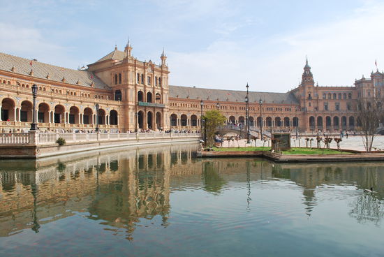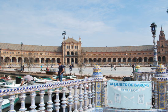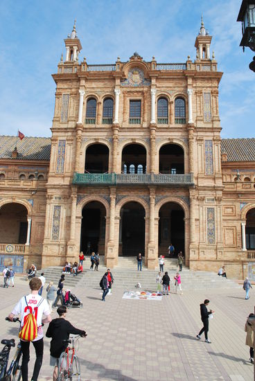 An der Plaza de España steige ich aus. Das Gebäude hier mit dem riesigen Platz war der spanische Pavillon zur ibero-amerikanischen Ausstellung 1929. Der Platz ist wunderschön, aber auch hier lungern wieder die Zigeunerinnen mit den Kräutersträußchen herum uns sind recht hartnäckig. Etwas unaufdringlicher sind die Kastagnetten-Verkäufer, die einem hier ihre Klapperdinger andrehen wollen.
