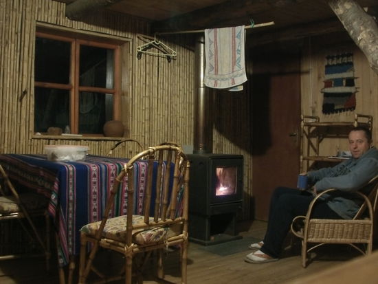 Ich helfe hier sechs Stunden bei verschiedenen Arbeiten und bekomme dafür Essen und Unterkunft für umsonst. Später sind es nur noch 3 Stunden, in denen ich vormittags Holz hacke und dafür verpflege ich mich selbst. Am Nachmittag erkunde ich die Gegend mit dem Motorrad und am Abend sitze ich vor dem Feuer. Es gibt Rindfleisch und Rotwein.