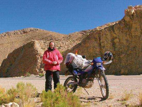 Ich hatte einen Käufer für mein Motorrad gefunden. Ein Amerikaner wollte die Maschine Mitte Juni in Santiago übernehmen. Am Ende sind wir uns aber nicht einig geworden. Meine Bewerbung verlief wie immer. Sie haben großes Interesse, sind aber nicht bereit, das Bewerbungsgespräch über Skype mit mir zu führen. Ich fühle mich wieder besser. Vieleicht hatte ich ja nur zuwenig gegessen oder ich brauche mehr Anpassungszeit an die Höhe ( 2500 m). Außerdem hatte ich mein Aspirin abgesetzt, da ich stendig Blut im Taschentuch hatte. Jetzt nehme ich wieder 100 mg täglich. Ich habe in den letzten Tagen viel hin und her überlegt und minütlich entgültige Beschlüsse gefasst. Soll ich nach Deutschland fliegen und Arbeiten gehen, noch kurz nach Bolivien abbiegen, an die Igazu Wasserfälle fahren mit einem kleinen Schwenk durch Brasilien und Paraquai oder weiter Richtung Kolumbirn reisen? Jetzt bin ich an der bolivianischen Grenze auf 3500 m und fühle mich gut. Auf halben Weg umkehren - nur im absoluten Notfall, sonst bleibt da für immer und ewig ein hätte, währe,wenn.