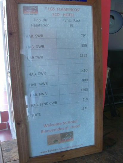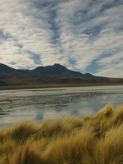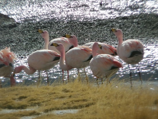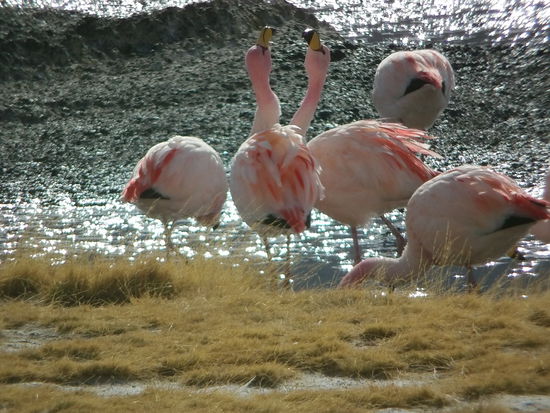 150 Bol für ein Bett im Dorm mit Frühstück, warm duschen 20 Bol extra, Kaffee 10 Bol, man gönnt sich ja sonst nichts. Es ist schön hier und ich bleibe eine Nacht. Das Besondere an dieser Lagune sind aber die Flamingos. Sie sind zahlreich und relativ zahm. Nirgendwo sonst konnte ich so nah an die Vögel heran.