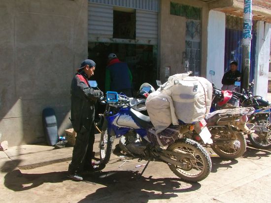 Während ich ein Foto schieße, fällt mein Motorrad um. Der Ständer ist in den weichen Boden versunken. Da hätte ich auch besser aufpassen können. Jedenfalls war es gar nicht so einfach das vollbeladene Bike wieder auf die Räder zu bekommen und der Spiegel ist abgebrochen. Euromot gibt es nicht in Peru, aber viele baugleiche Motorräder und so ist es kein Problem in der nächsten Werkstatt Ersatz zu bekommen.