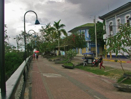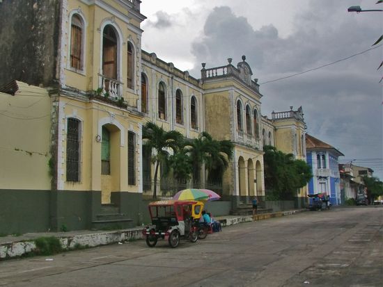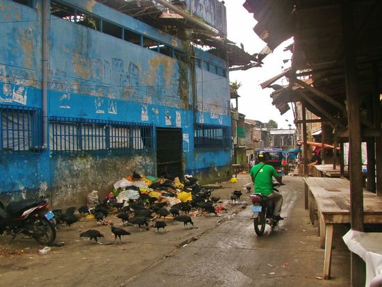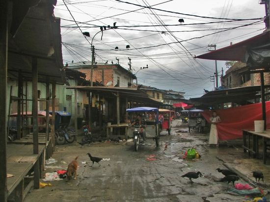 Ich bleibe drei Tage in Iquitos. Bei einem meiner Spaziergänge höre ich von oben lautes Geschrei. Es klingt wie Bärnn oder so. Die Welt ist ein Dorf, man trifft sich immer wieder. Es sind die Leute vom Schiff. Sie haben ein gutes Hostal, finden Iquitos schön und wollen zwei Wochen bleiben. Ich finde die Stadt spannend, würde sie aber nicht unbedingt weiter empfehlen. Soviel Dreck, Müll und Geier kann ich nicht als schön empfinden. Andererseits gehe ich am Wochenende durch die Straßen. Die Leute sitzen vor der Tür, trinken, sind fröhlich und ausgelassen. Männer tanzen vor ihren Häusern und lachen mir zu. Andere schütteln mir die Hand und reden mit leuchtenden Augen auf mich ein. Ich höre zu und sage nach einer Weile, sorry no Espanol. Dann werden die Augen noch größer, alle lachen und ich verabschiede mich. Ja, trotz all des Unrats, es ist eine gute Stimmung hier.