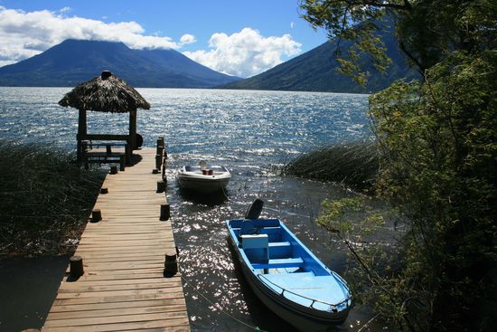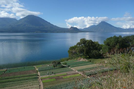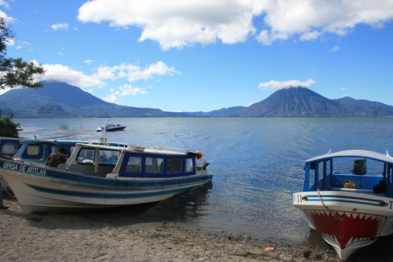 Von San Cristobal führte uns wieder eine abenteuerliche, kurvenreiche Busfahrt durch die gebirgigen Wälder von Chiapas nach Guatemala. Grenzformalitäten - no problems. Die aufregende ganztägige Busfahrt führte uns am 01.01.2010 zum wohl beeindruckendsten Naturschauspiel Guatemalas, dem 400 m tiefen Lago de Atitlan. Am Ufer des 1.562 m hoch gelegenen Sees reihen sich 13 Dörfer mit fast ausschließlich indigener Bevölkerung aneinander. Wir kamen am späten Nachmittag in Panajachel an und erlebten den Farbwechsel des Wassers von Tiefblau bis nahezu Schwarz. Majestätisch erheben sich im Süden die drei Vulkane San Pedro, Toliman und Atitlan. Am nächsten Tag führte uns eine abenteuerliche und Teils nasse Bootsfahrt nach San Marcos und San Pedro La Laguna, wo die Indigenas neben dem Feldbau vor allem durch die Fertigung von Matten und Taschen aus Agavenfasern den Lebensunterhalt erzielen. San Pedro ist obendrein ein beliebter Treff von Individualtouristen und Ausgangsort für die Besteigung des gleichnamigen Vulkans.