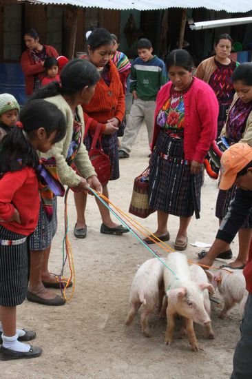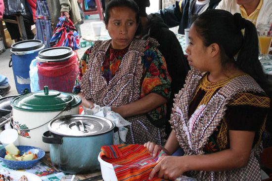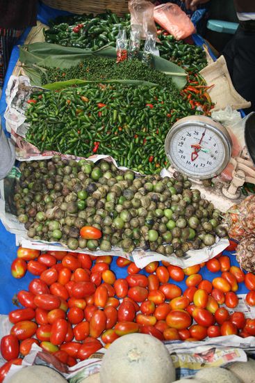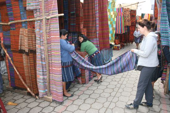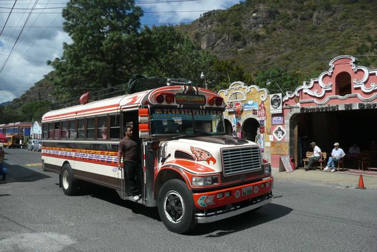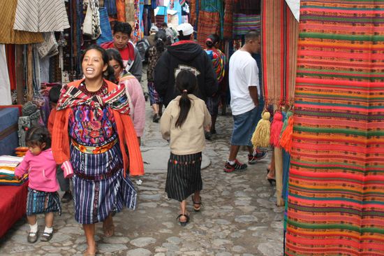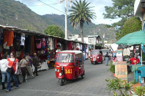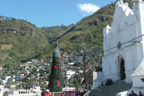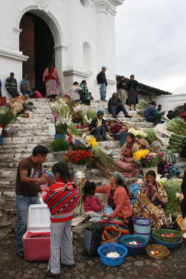 Ein Tagesausflugs führte uns sonntags zum berühmtesten und größten Markt Guatemalas. Ungezählte indianische Händler und Busladungen von Touristen strömen nach Chichicastenango, das religiöse Zentrum der Quiche. Auf der großen Plaza und in den Seitengassen findet man dicht gedrängt einen Stand nach dem anderen mit Antiquitäten, Keramiken, Schmuck und für den Geschmack der Touristen gefertigten Textilien - oft auch zu überhöhten Preisen. An Markttagen beten Indigenas, fortwährend Räucherkessel schwingend, auf der halbkreisförmig angelegten Treppe vor der Kirche Iglesia Santo Tomas. Frauen verkaufen auf den untersten Stufen Blumen, die dann in der Kirche als Dank für die gute Ernte oder den guten Verkauf geopfert werden. Im Inneren gedenken die Mayas nach uraltem Brauch der Seelen der Verstorbenen und opfern dabei Kerzen und Schnaps (aguardiente).