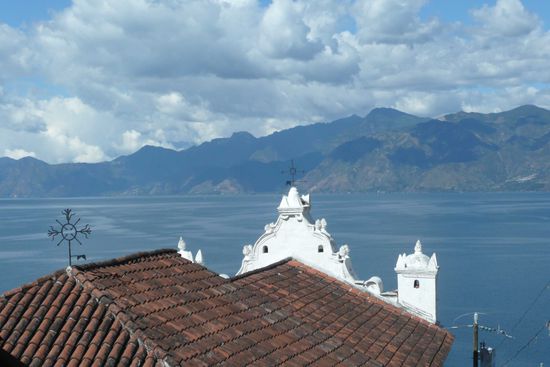 In San Antonio Palopo reihen sich die Häuser steil den Hang hinauf. Von der erhöht gelegenen Kirche aus dem 16. Jh. genießt man eine fantastische Aussicht auf den See. Ein weiteres Highlight war die Taxifahrt zu den einzelnen Dörfern rund um den See. Wir konnten einen Stopp einlegen, wo wir wollten, die Indigenas bei Ihrer Arbeit beobachten, die Märkte rund um den Kirchen besuchen und vor allem herrliche Ausblicke auf die umliegenden Vulkane und auf den See genießen.