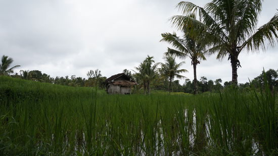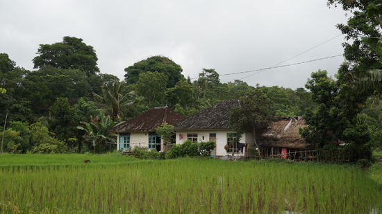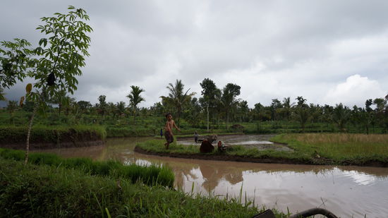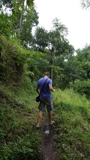 Dank zeitiger und arg verregneter Ankunft in Tetebatu sollte eine Reisfeldwanderung den Tag abrunden. Untergekommen im Rumah Daun Homestay, war der Besitzer gleich Feuer und Flamme für die Idee und hat uns ohne großes Zögern seinen Sohn als Guide an die Hand gedrückt. Spätestens beim Verlassen der Strasse haben wir unsere Schuhwahl verdammt. Nach einem Regenguss quer durch Wiese, Wald, Gras und Morast zu wandern, führt mit Flipflops und Sandalen nicht unbedingt zu einer reibungslosen Fortbewegung. Da hilft dann nur noch eines, Flipflops ausziehen und barfuss weitergehen Und die Rutschpartie lohnt sich allemal: es ist grün, wohin man auch schaut, unterschiedlichste Anbaustadien - einige Felder sind abgeerntet, andere gerade erst neu bepflanzt - überall kleine Kanäle zur Bewässerung, in der Luft schwirren Libellen und es zirpt an allen Ecken. Zwischendrin kamen einige hilfreiche Erläuterungen unseres Guides mitsamt "Bezeigung" allerlei floristischer Eigenarten, u.a. auch der Cassava, die jedoch nur Fragezeichen in unsere Augen zaubern konnte. Zu guter Letzt fing es wieder an zu regnen, und durchnässt bis wirklich auf die allerletzte Pore kamen wir am Ausgangspunkt wieder an, argwöhnisch beäugt von allen Dorfbewohnern aus Ihren mehr oder weniger trockenen Unterständen.