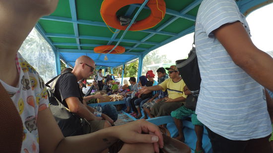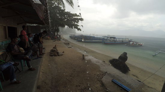 Wir durften das heimelige Ambiente des Minibusses verlassen und im Bunga Bunga Cafe Platz nehmen, während der Bus ohne uns in den Hafen fuhr. Wir machten uns auf die Suche nach Passierschein 38A mit nutzloser Unterstützung der unzähligen Silvios im und um das Cafe. Weitere Touris kamen, keiner wusste genaueres. Nach einer dreiviertel Stunde fand die Sause ein Ende, wir durften uns auf Geheiß von Obersilvio den Weg zum Hafen bahnen, mit dem Hinweis, sich rechts zu halten wegen den finalen Fährtickets. Böse Falle sage ich nur. Man läuft auf ein recht neues und modernes Gebäude zu, dessen einziger Zweck jedoch die Bereitstellung der sanitären Einrichtungen ist. Kein Ticketschalter... also heisst es suchen, Runde drehen und Verkaufsstände in Panik überrennen. Aber halt... der letzte verbliebene Punkt bevor es an den Strand geht, dieses von aussen ziemlich mitleiderweckende Hüttchen, da sitzt ja jemand. Und dieser jemand hat uns tatsächlich Tickets getauscht mit dem Hinweis, da und da zu warten. Merke: es geht erst los, wenn das Boot voll ist. Und voll heisst im Regelfall auch voll - denkt immer an das Glas voller Steine, in dass - obwohl voll - immer noch Sand reinpasst und zu guter Letzt auch noch Wasser. Andere mitreissende Mitreisende haben sich dann recht schnell gefunden und schon schaukelte die Jolle gen Gili Air. Dort angekommen, kam just im Moment des Boot verlassens ein ordentlicher Guss herunter. Also blieb nix anderes übrig als im Hafengebäude unterstellen und warten... und den an immer neuen Stellen reinregnenden Bächen ausweichen. Und gleichzeitig konnte man sich nochmal am Anblick so vieler Menschen vereint erfreuen - das sollte es die nächsten 2 Tage nicht mehr geben.