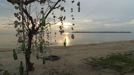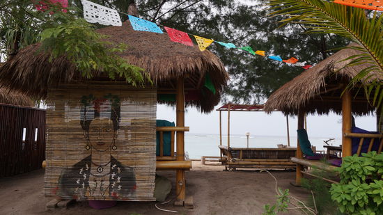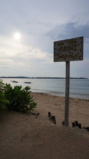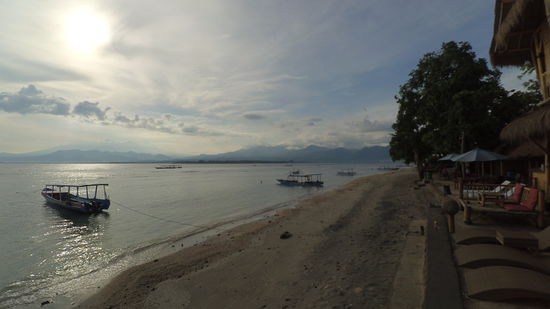 Gili Air war tatsächlich ruhig, fast schon zu ruhig. Es war wenig bis gar nix los, abends waren in einigen Bereichen gleich mehrere Restaurants hintereinander komplett leer, also ohne jegliche Touristenseele. Für Entspannung und Erholung absolut perfekt. Man kann wunderbar in den ganzen Bars und Restaurants direkt am Strand oder sogar über dem Wasser sitzen/liegen/fläzen, abchillen, den Ausblick genießen, dem heiligen Bintang frönen und ganz hervorragend essen. Das Wetter hatte es leider ohnehin nicht so gut gemeint, sodass wir mehr auf Dachsuche als am Strand waren. Für den Inselrundgang hat es zum Glück trotzdem gereicht. Erstaunlich viel unbebautes Gebiet, viele lauschige Lokalitäten, die den Rundgang deutlich zu verlängern schaffen *hicks* und im Südwesten ein grandioses Sonnenuntergangs-Panorama: vor einem Meno und Trawangan, etwas mehr nach links Bali am Horizont und noch weiter nach links Lombok. Und eine Frage beschäftigt uns noch heute: darf man ein open-air-Bad samt Toilette auch nutzen während eines Gewitters?